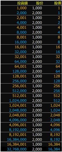 5. 新創公司創立成功後,初始股價將定為$1,投資人以當初的投資額兌換為同等價格的股份。然而若釋出的初始股份數量因此大於2000,那初始股價則會乘以2,直到釋出股份數量小於等於2000為止。當初始股價在$1元以上時,投資額當初投資金額不足購買1股股份的額度將會退款給投資人。但這個退款動作也可能導致釋出的初始股份小於1000,此時股價則會除以2回來,在此情況下,初始釋出股份會大於2000。